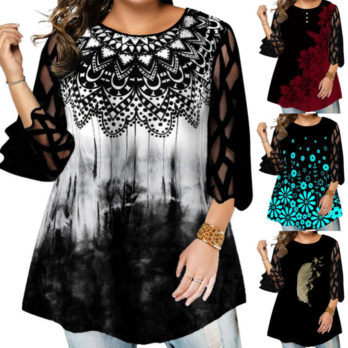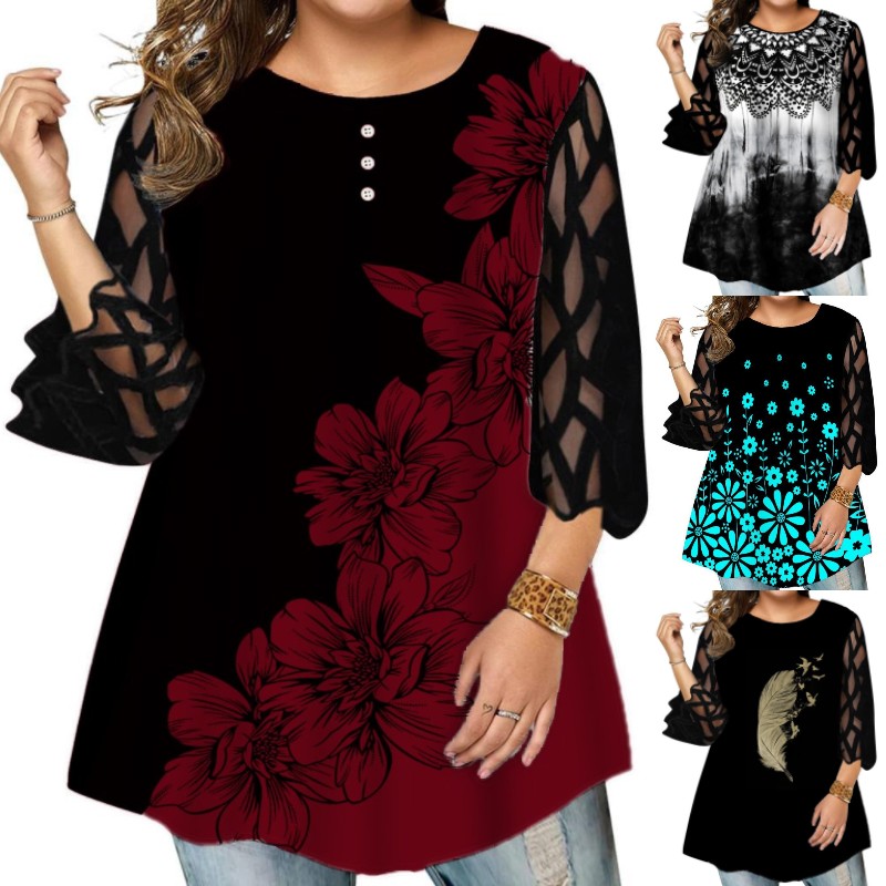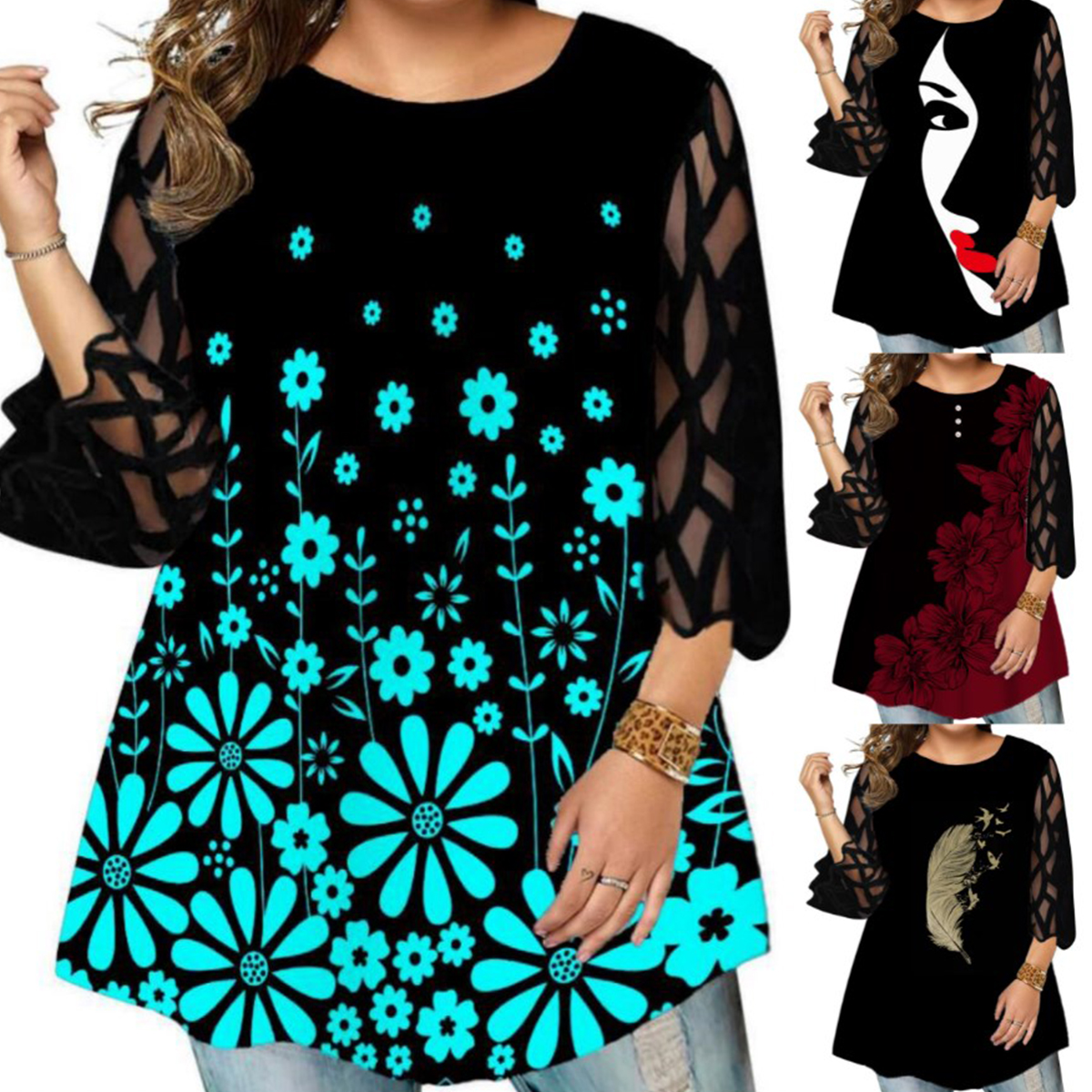 š„š[Promocja ograniczona czasowo]š¹š [L-6XL] 2025 nowe damskie bluzki z okrÄ gÅym dekoltem i nadrukiem, z dÅugimi rÄkawami - koronkowe krótkie rÄkawy - duży rozmiar luÅŗny