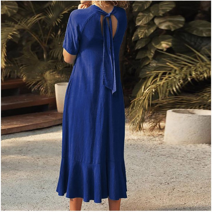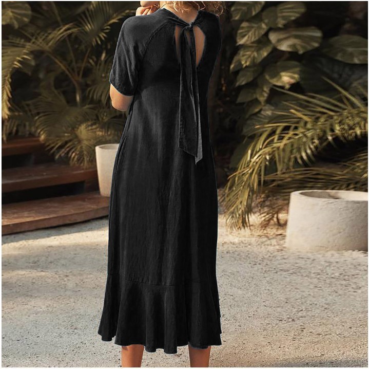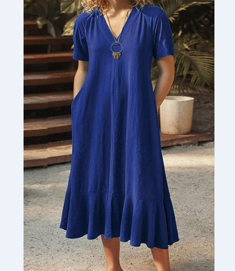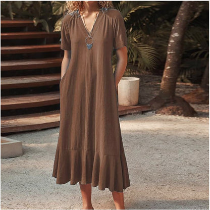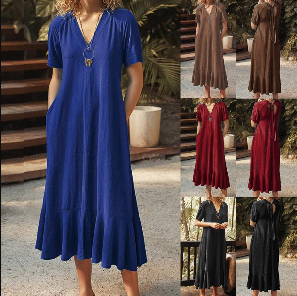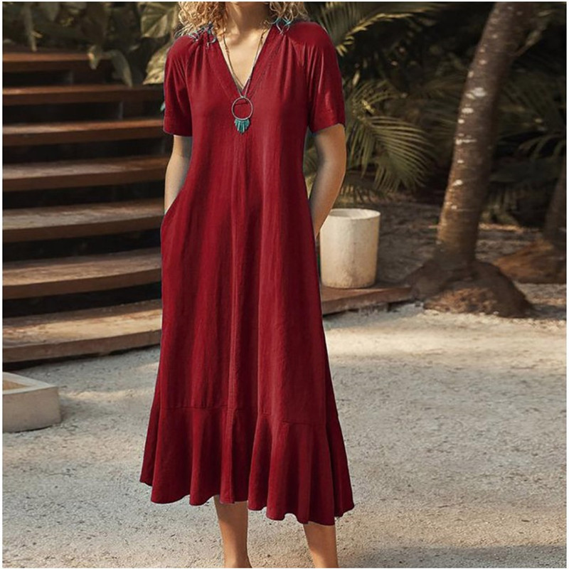 2024 bawełniana lniana długa sukienka z krótkimi rękawami i dekoltem w serek 3683165