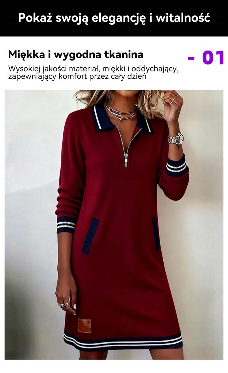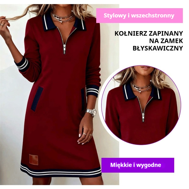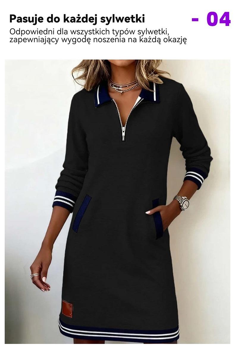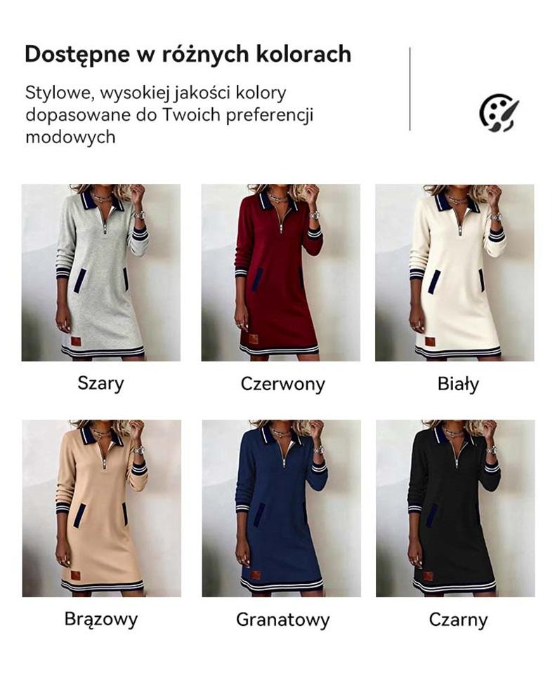 Zimowa, nowa, swobodna sukienka z zamkiem błyskawicznym, kołnierzykiem, długim rękawem i kieszenią w blokowym kolorze