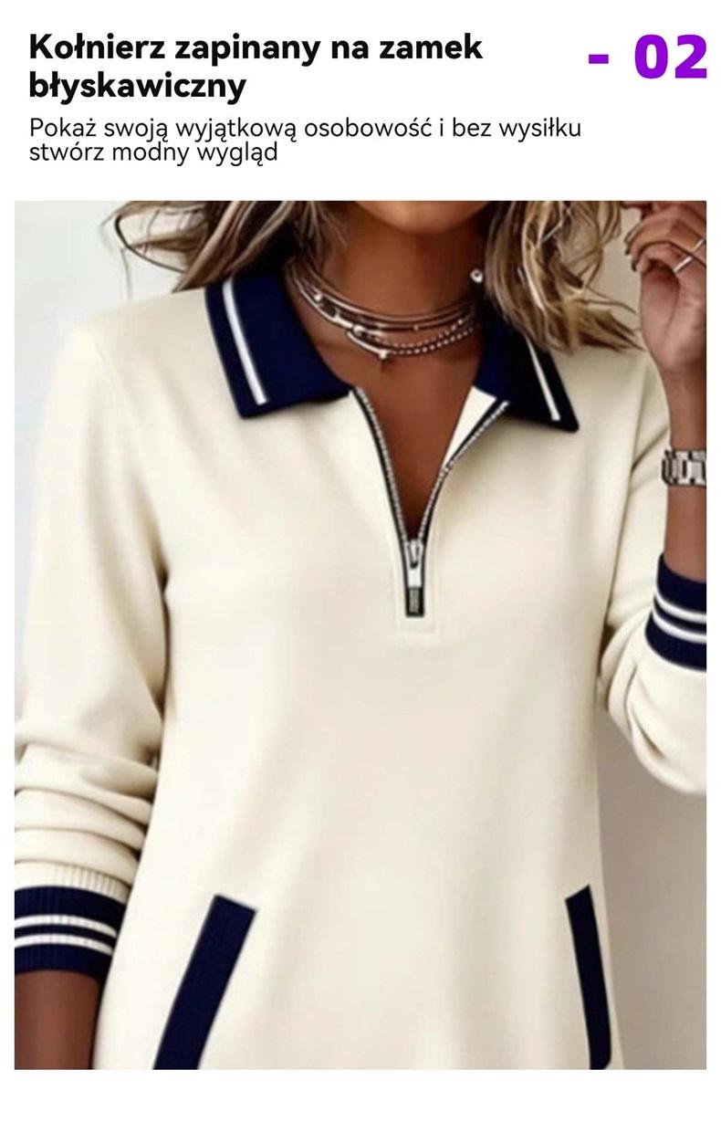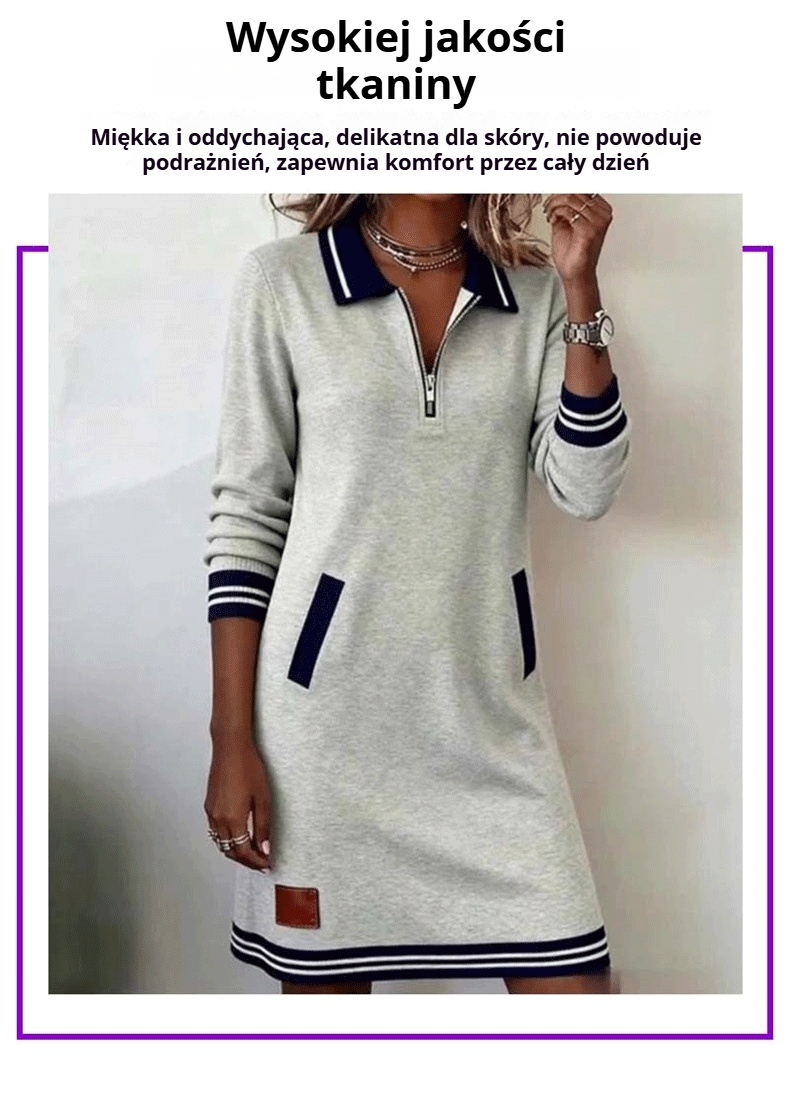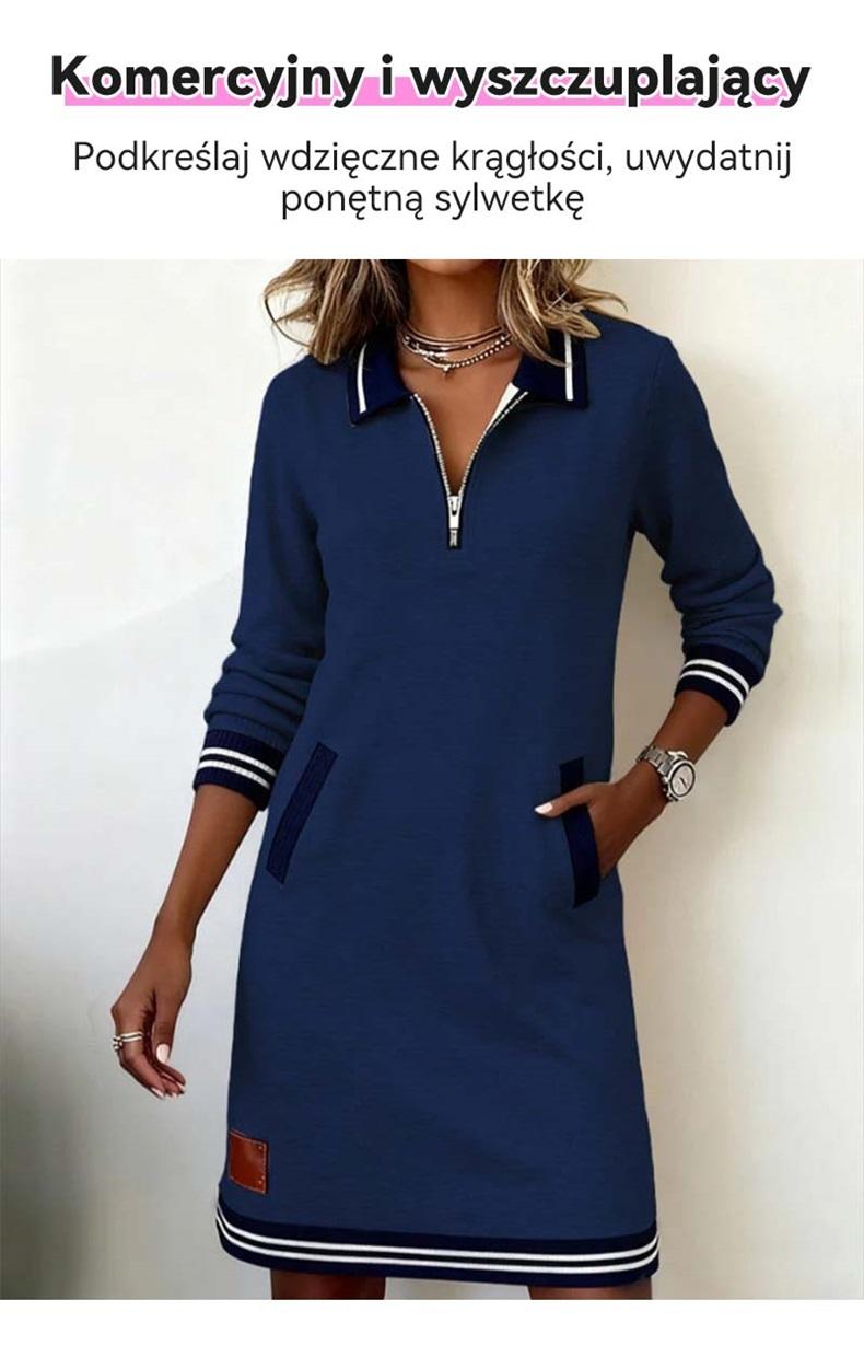Zimowa, nowa, swobodna sukienka z zamkiem błyskawicznym, kołnierzykiem, długim rękawem i kieszenią w blokowym kolorze