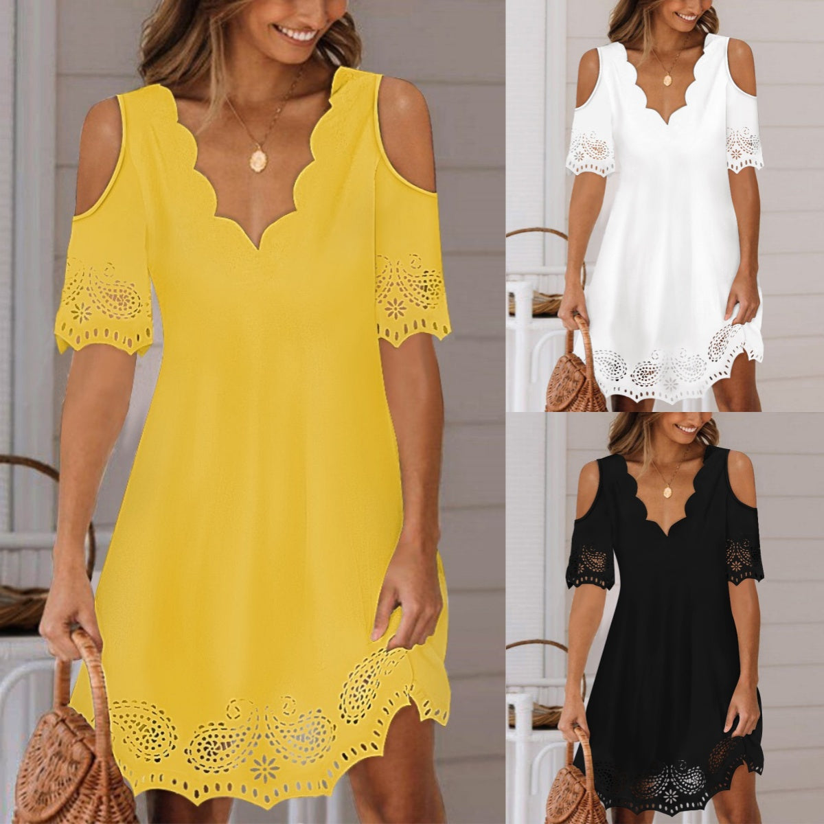 Zniżka 49% 🥰🥰🥰 【S-3XL】Średniej długości sukienka z krótkim rękawem i koronkowym dekoltem w serek 3744735